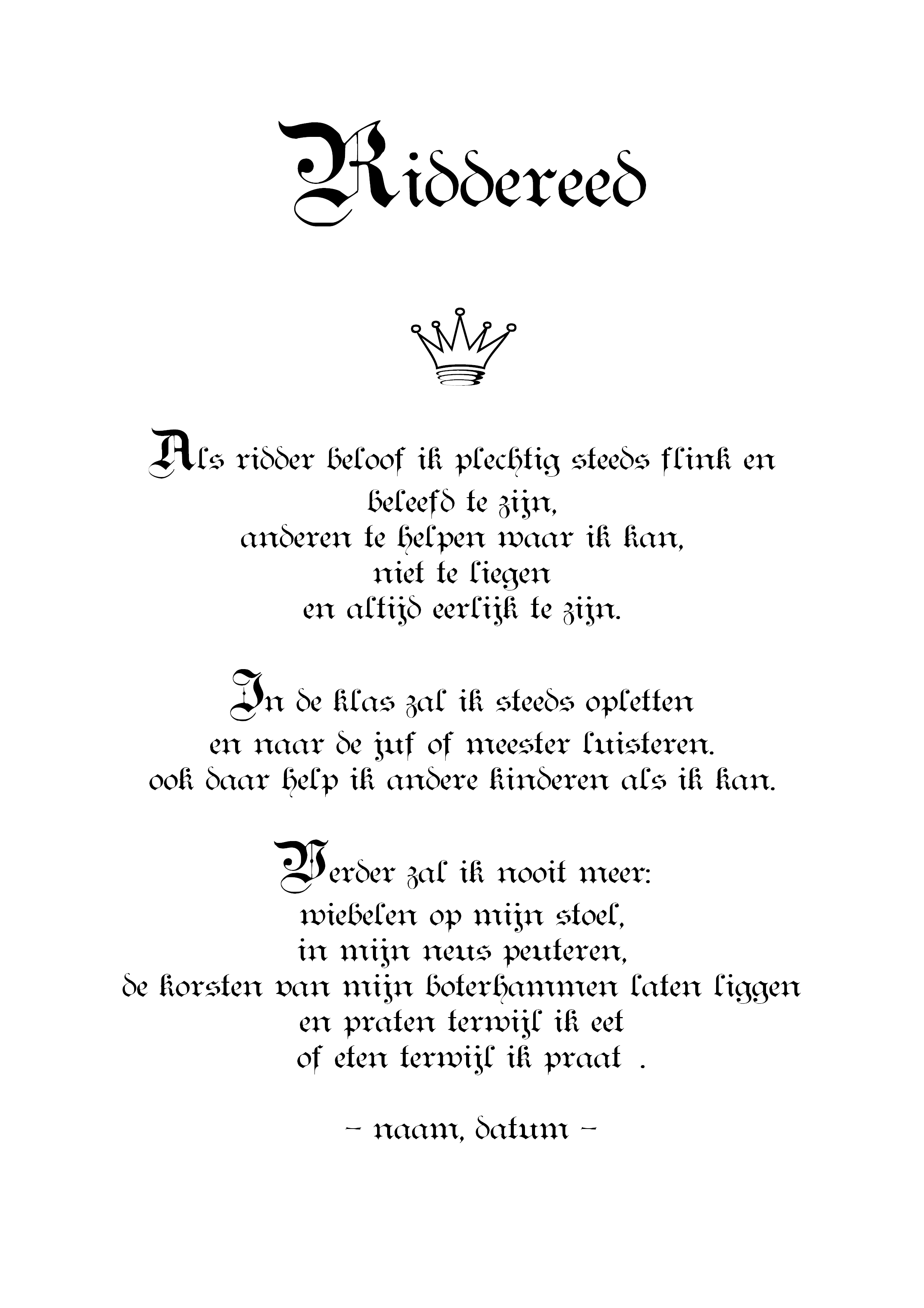 Download de riddereed, compleet met gotische letters én een kroontje! Beloof wel plechtig dat je dit op gekleurd papier afdrukt... :) :